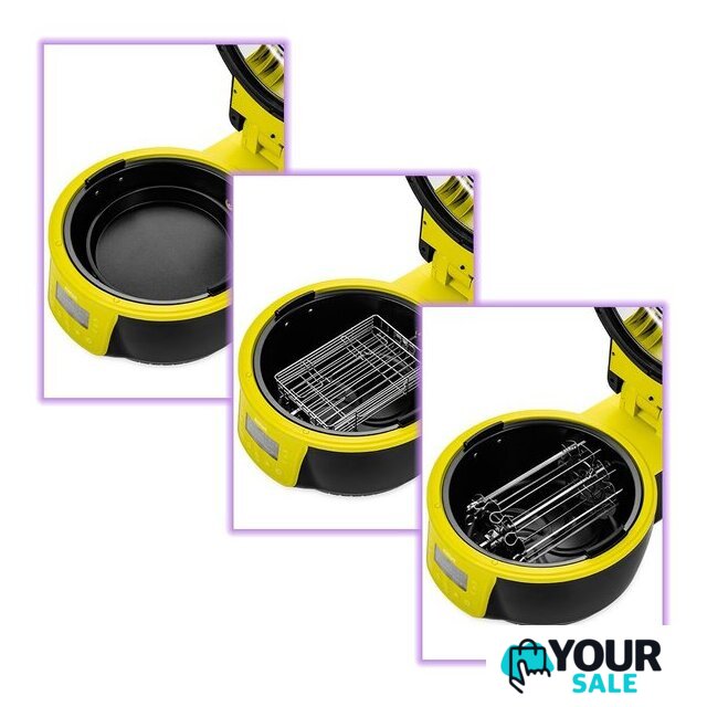 | Комплект поставки | - аэрогриль- вертел- держатель вертела- противень- решетка- решетка для стейков- вращающаяся корзина- шампуры- щипцы- фильтр |