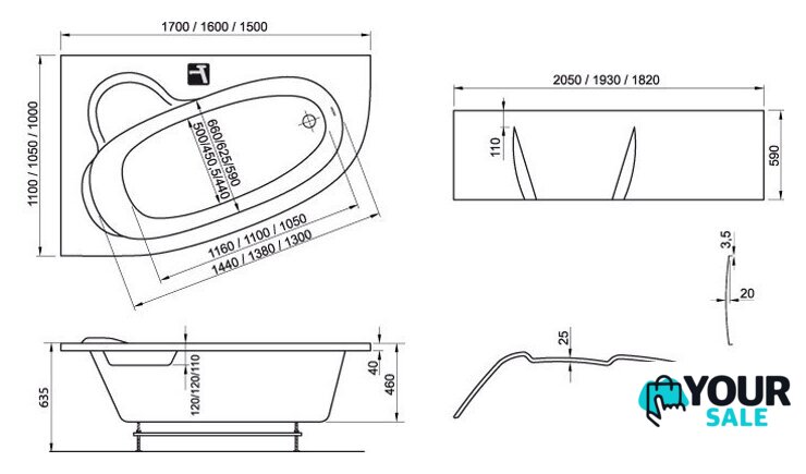 | Форма | угловая ассиметричная |