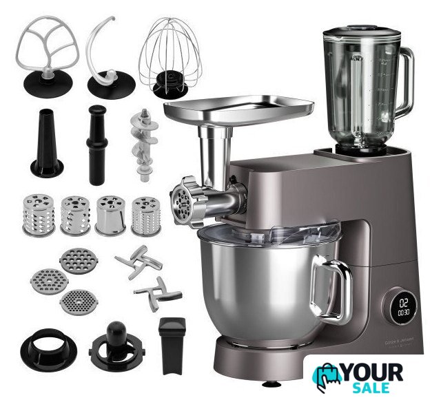 | Полная комплектация | Планетарный кухонный комбайн GÖTZE & JENSEN SB800T, чаша 6 л, чаша 7 л, 2 крышки для чаш, крюк для теста, взбиватель, плоский миксер, измельчитель (толкатель, барабан для измельчения, крупная терка, средняя терка, мелкая терка), мясорубка (корпус, толкатель, лоток, шнек, нож, сито 3 мм, сито 5 мм, сито 7 мм, кольцо, насадка для пюре, насадка для кеббе), чаша блендера, крышка блендера, руководство по эксплуатации с условиями гарантии. |