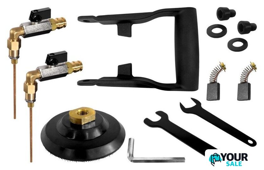 | Комплект поставки | – Дополнительная ручка – 1 штука., – Дополнительные шайбы с ручками – 2 штуки., – Винты, фиксирующие дополнительную ручку – 2 штуки., – Кран для воды – 2 штуки., – 100 мм гибкий диск – 1 персон., – 8 мм шестигранник – 1 диск., – Открытый ключ 17 мм – 1 штука., – Открытый ключ 26 мм – 1 штука., – Запасные кисти – 1 комплект |
