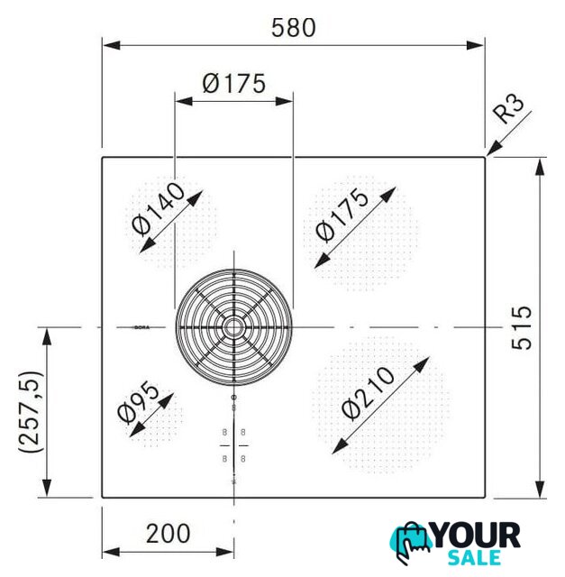 | Подробная информация о конфорках | Задняя левая конфорка - диаметр 140 мм, мощность 0.9/1.35 кВт; передняя левая - диаметр 95 мм, мощность 0.4/0.6 кВт; задняя правая и передняя правая - диаметр 230х230 мм, мощность по 2.1/3 кВт каждая. |
