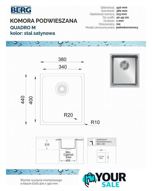 | Комплектация | Злевоzmywak wyposażony w korek ręczny, zestaw przelewowo odpływowy z przedłużką i syfonem oraz elementy mocujące |