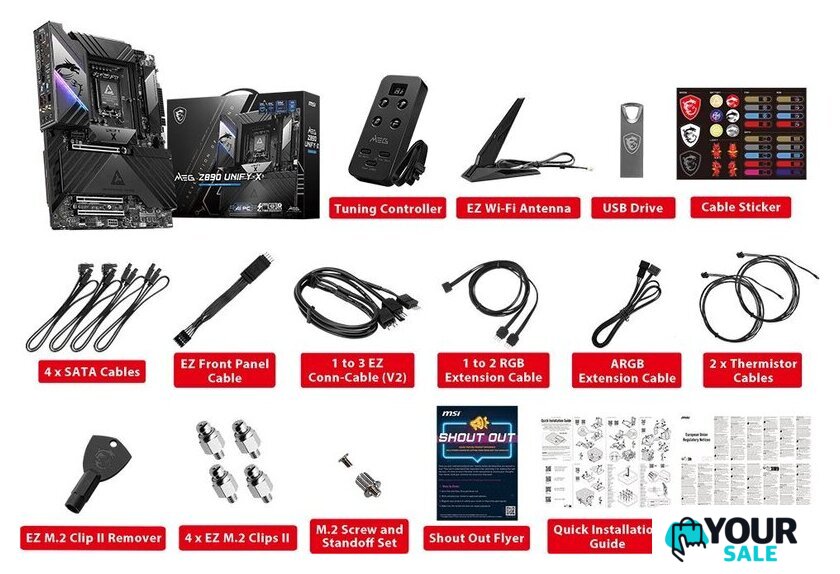 | Комплектация | - MEG Tuning контроллер - EZ Wi-Fi антенна - USB Flash накопитель - стикеры для кабелей- 4 кабеля SATA- EZ кабель фронтальной панели- 1EZ - 3EZ кабель - 1RGB - 2RGB кабель-удлинитель - ARGB кабель-удлинитель- 2 кабеля термистора - ключ-экстрактор EZ M.2 Clip II - монтажный комплект для M.2- документация |