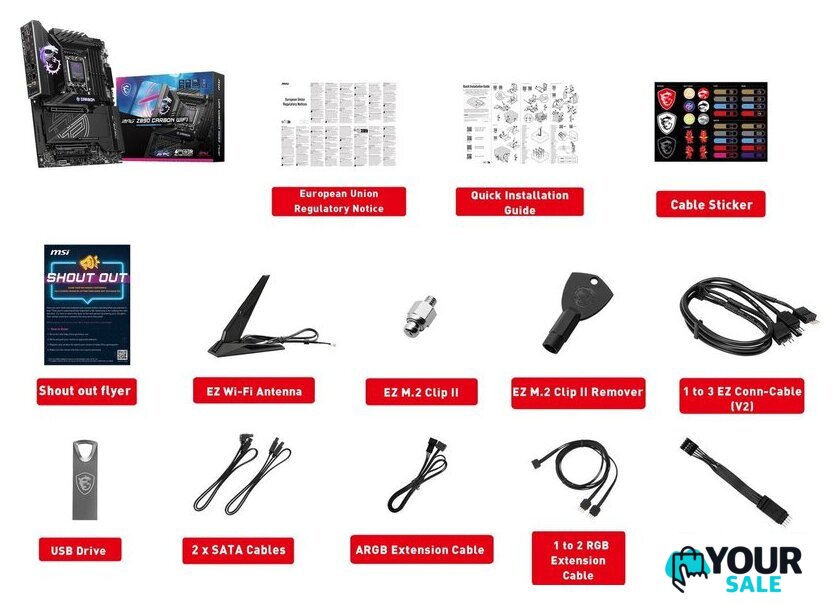| Комплектация | - EZ Wi-Fi антенна - USB Flash накопитель - стикеры для кабелей- 2 кабеля SATA- EZ кабель фронтальной панели- 1EZ - 3EZ кабель - 1RGB - 2RGB кабель-удлинитель - ARGB кабель-удлинитель- ключ-экстрактор EZ M.2 Clip II - винт со стойкой EZ M.2 Clip II- документация |