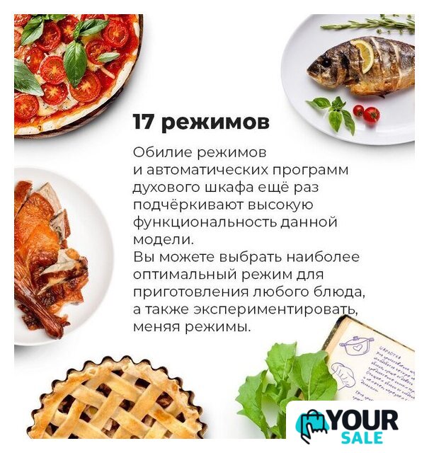 | Режимы работы | нижний нагрев, двухсторонний нагрев, большой гриль, гриль + конвекция, нижний нагрев + конвекция, двухсторонний нагрев + конвекция, размораживание, предварительный разогрев духовки, подготовка теста |