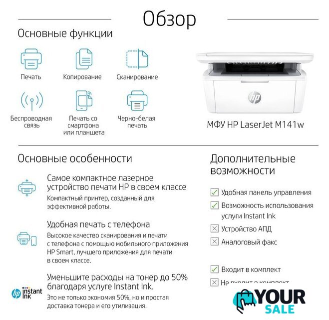 | Комплектация | МФУ HP LaserJet M141a; кабель питания; картридж HP LaserJet с черным тонером (ресурс: 500 страниц); плакат с инструкциями по настройке; справочное руководство; руководство по гарантии; рекламная листовка |