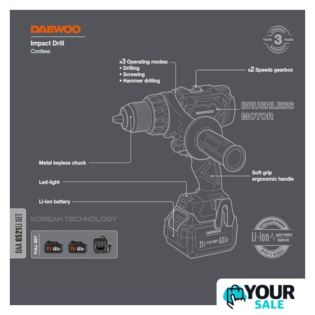 | Комплектация | - Дрель-шуруповерт - 1 шт.- Аккумулятор 4,0 Ач - 2 шт.- Зарядное устройство - 1 шт.- Дополнительная рукоятка - 1 шт.- Скоба для крепления - 1 шт.- Инструкция- Кейс |