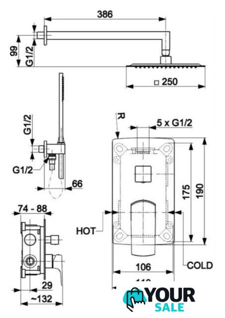 | Комплектация | верхний душ, ручной душ (лейка), держатель лейки, шланг, смеситель |