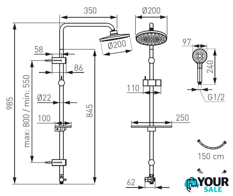 | Комплектация | верхний душ, штанга, ручной душ (лейка), держатель лейки, шланг, полочка |