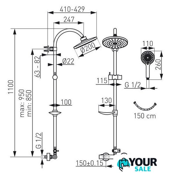 | Комплектация | верхний душ, штанга, ручной душ (лейка), держатель лейки, шланг, смеситель, мыльница или держатель для мыла |