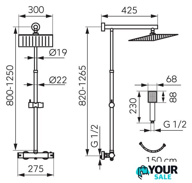 | Комплектация | верхний душ, штанга, ручной душ (лейка), держатель лейки, шланг, смеситель |