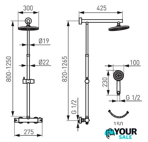 | Комплектация | верхний душ, штанга, ручной душ (лейка), держатель лейки, шланг, смеситель |