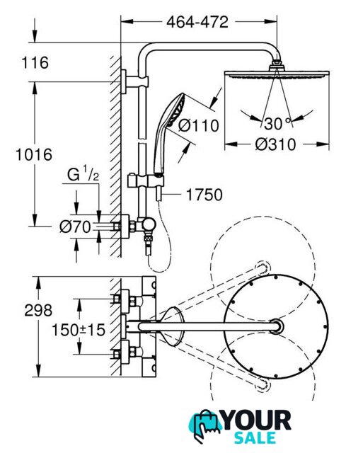 | Диаметр (ширина) верхнего душа | 310 мм |