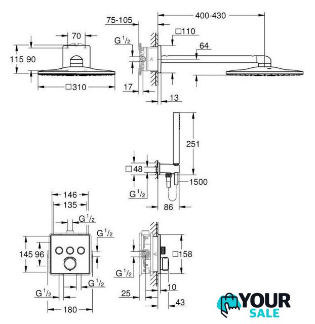 | Диаметр (ширина) верхнего душа | 310 мм |