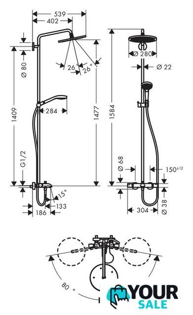 | Диаметр (ширина) верхнего душа | 280 мм |