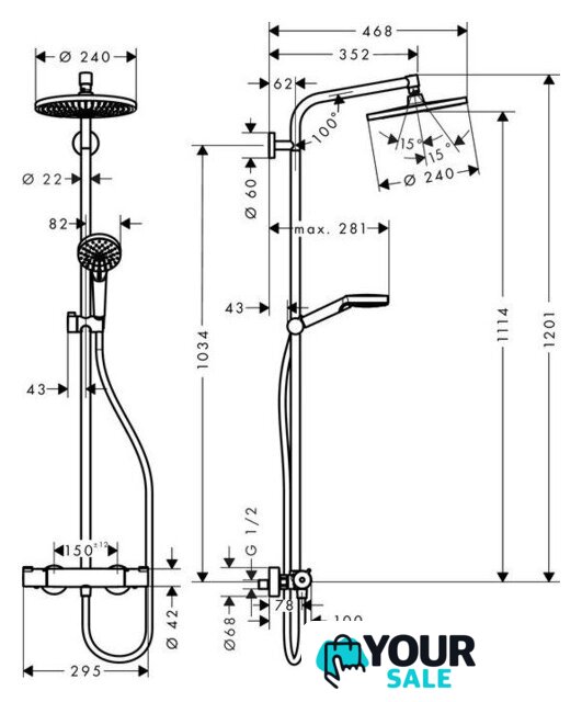| Диаметр (ширина) верхнего душа | 240 мм |