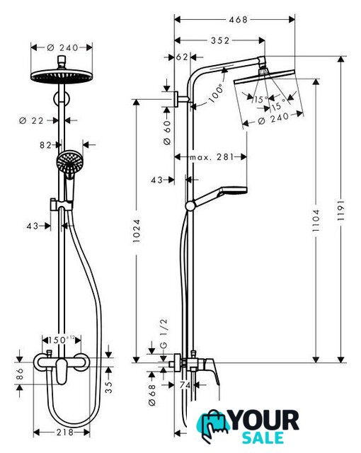 | Диаметр (ширина) верхнего душа | 240 мм |