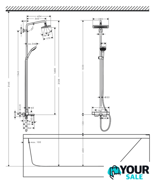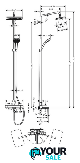 | Диаметр (ширина) верхнего душа | 280 мм (280x170) |