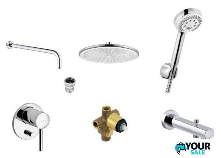 | Комплектация | верхний душ, ручной душ (лейка), держатель лейки, шланг, смеситель, излив для ванны |