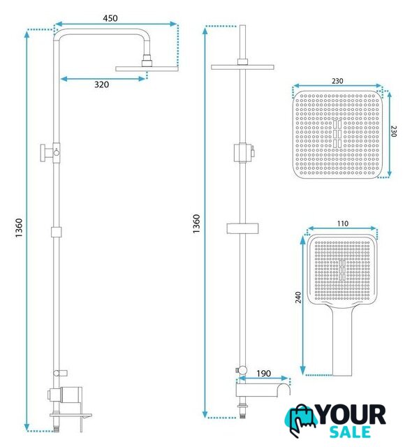 | Комплектация | верхний душ, штанга, ручной душ (лейка), держатель лейки, шланг, смеситель, излив для ванны |