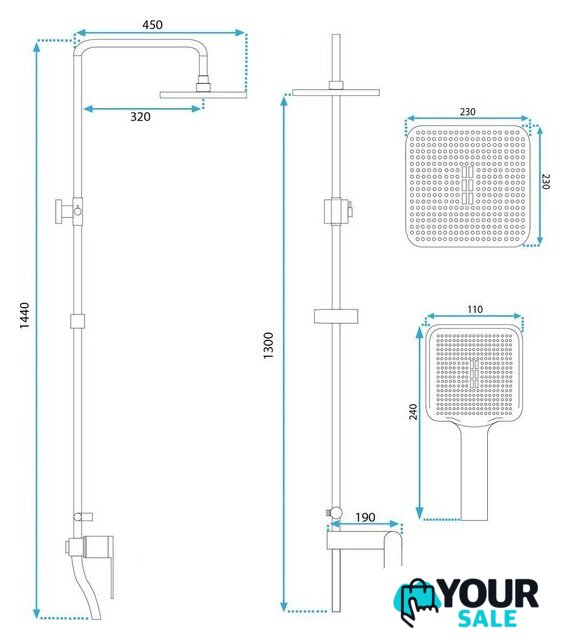 | Комплектация | верхний душ, ручной душ (лейка), держатель лейки, шланг, смеситель, излив для ванны |