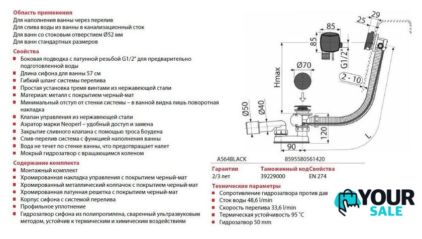 | Диаметр сливного отверстия | 52 мм |